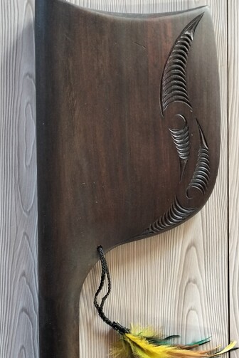 A Tewhatewha is commonly known as a chiefly weapon. A Tewhatewha is a carved long-handled Māori club weapon shaped like an axe. Designed to be held in two hands, the weapon comes to a mata (point) at one end and a rapa (broad, quarter-round head) at the other.